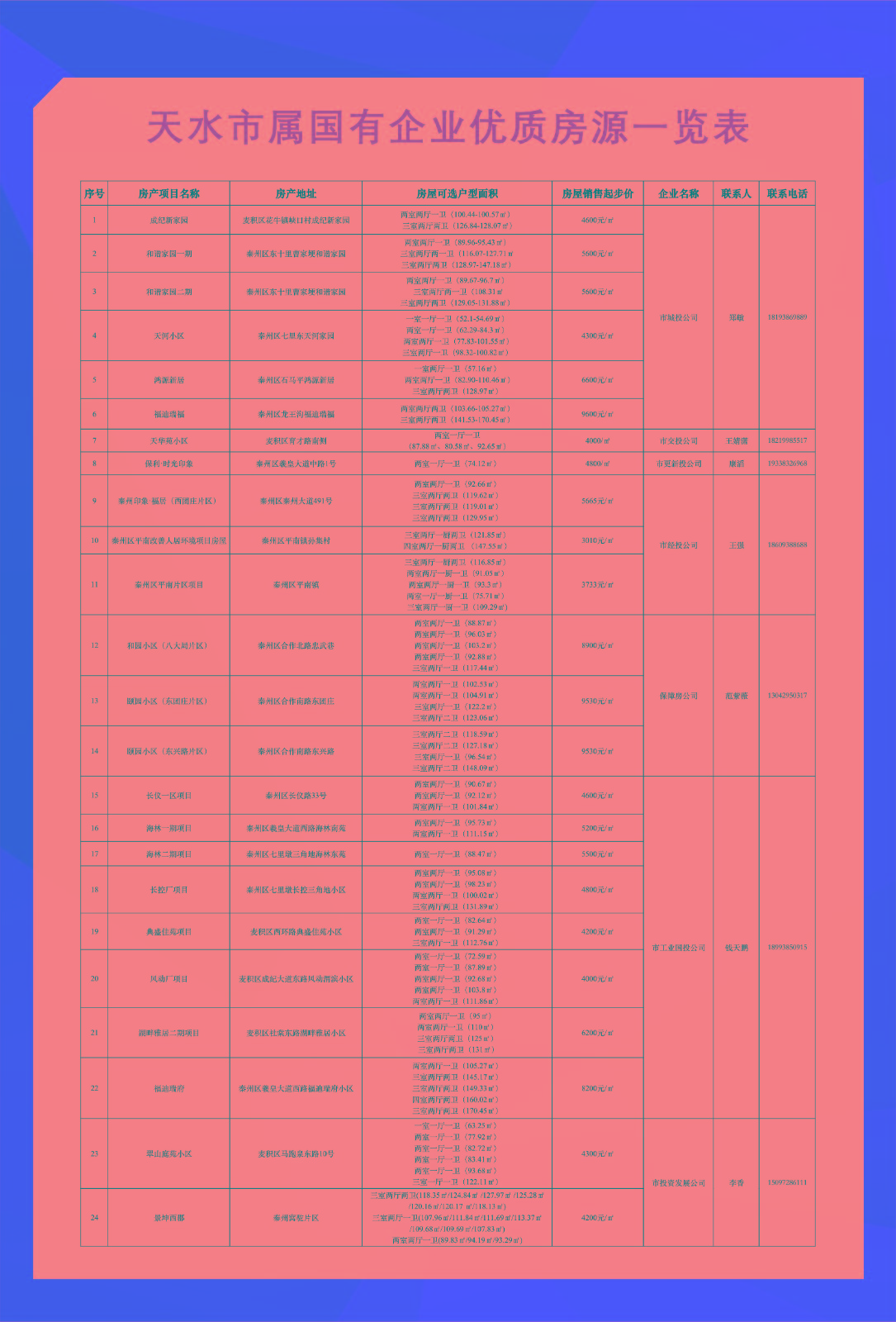 | 15 | 长仪一区项目 | 秦州区长仪路33号 | 两室两厅一卫(90.67㎡) 两室两厅一卫(92.12㎡) 两室两厅一卫(101.84㎡) | 4600元/㎡ | 市工业国投公司 | 钱天鹏 | 18993850915 |